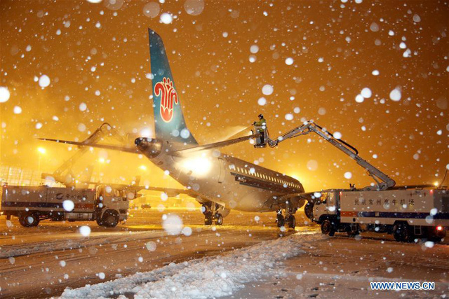 Đến nay, ít nhất 3 sân bay ở Trung Quốc buộc phải tạm ngừng hoạt động do tuyết rơi dày. (Ảnh: China News)