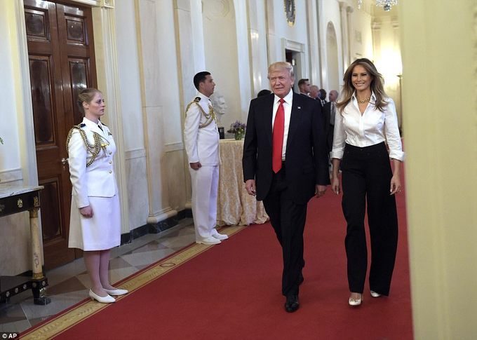 Tham dự sự kiện cùng chồng hồi tháng 5, bà chủ Nhà Trắng toát lên vẻ sang trọng, quý phái với set đồ mang phong cách menswear gồm áo sơ mi trắng và quần suông đen của Ralph Lauren.