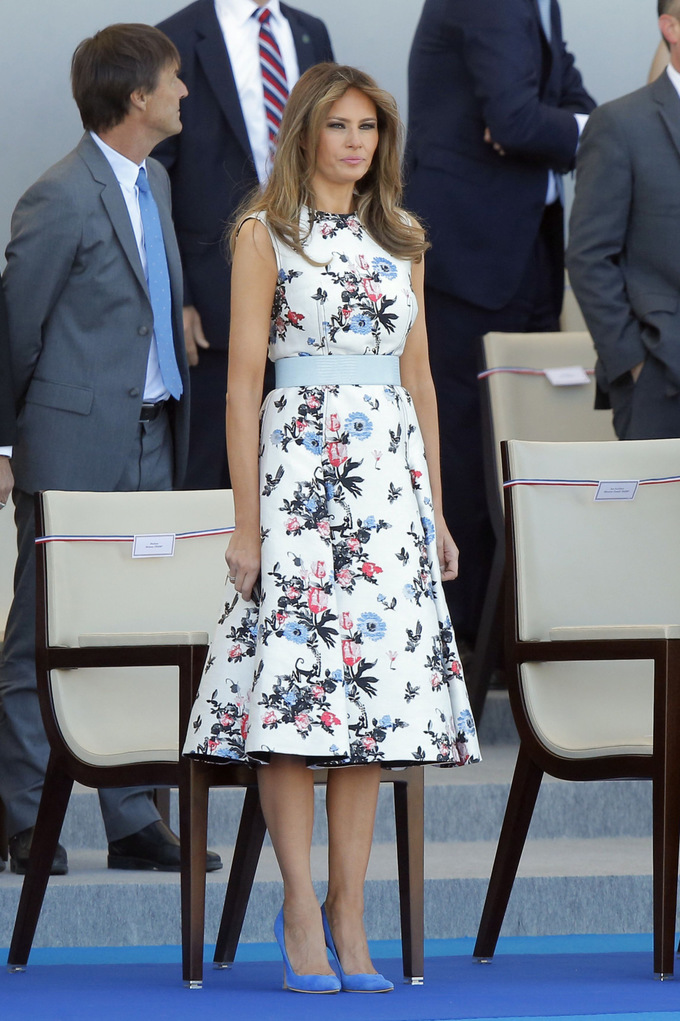 Tại sự kiện diễu hành hôm 14/7 trên Đại lộ Champs-Elysees, Pháp, người đẹp 47 tuổi xuất hiện trong bộ đầm hoa của Valentino kết hợp cùng cao gót màu xanh.
