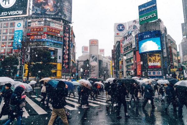 Giá lạnh và tuyết rơi chỉ làm lượng người qua lại ngã tư Shibuya vơi đi đôi chút. Khu vực này được xem là điểm ăn chơi du lịch nổi tiếng nhất ở Tokyo và nếu chưa tới đây thì coi như đã uổng phí cả chuyến đi.