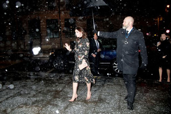 Nhiệt độ ở Anh tối qua giảm sâu, nhiều nơi âm 11 độ C nhưng công nương cũng chỉ mặc một chiếc váy mỏng manh. Có duy nhất chiếc ô được che trên đầu để bảo vệ cô khỏi bị tuyết rơi vào người nhưng Kate vẫn luôn nở nụ cười tươi tắn từ khi bước ra khỏi xe.