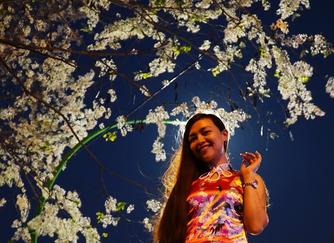 Chị Thùy Anh, người Đà Lạt hiện học tại Hà Nội, tình cờ thấy hoa nở đẹp bên đường Thanh Niên cũng dừng xe lại để chụp vài bức ảnh lưu nhớ thời gian ở thủ đô.