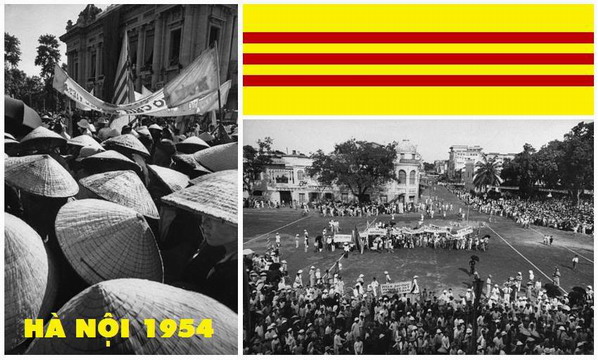 Ảnh cờ VNCH tại Tràng Tiền năm 1954, trước khi Việt Cộng xâm lăng thành phố. "Giải phóng Hà Nội" được diễn ra vào ngày 10/10/1954.