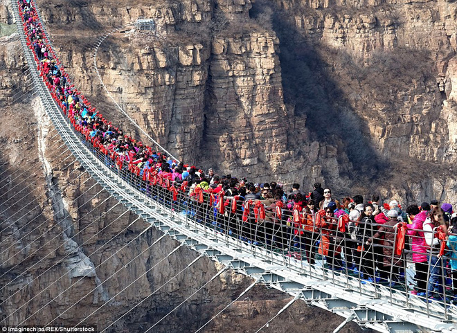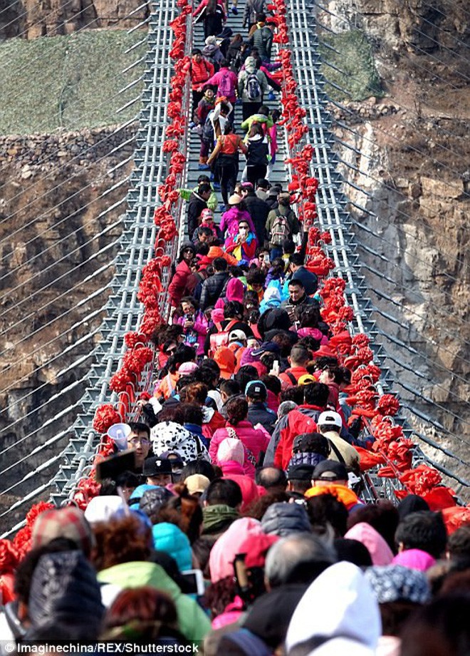 Đứng trên cây cầu trong suốt đã sợ, đây lại còn chen chúc hàng trăm con người như này thì quả là trải nghiệm khá mạo hiểm.