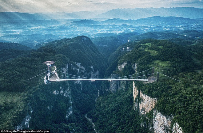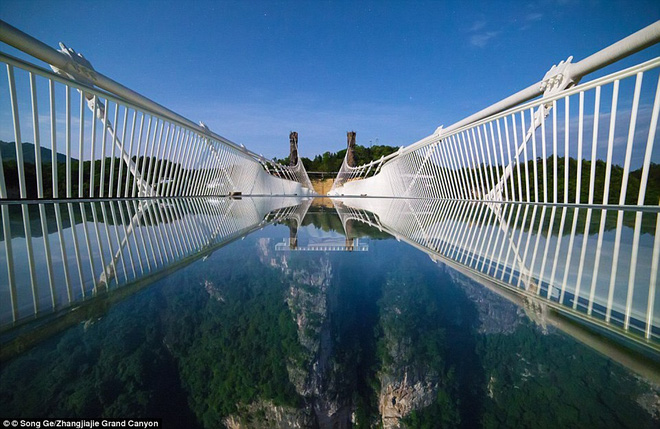 Cây cầu nặng khoảng 70 tấn, bắc qua 2 vách núi với khoảng 1,077 tấm kính.