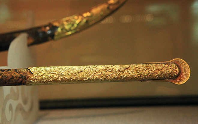 Phần đuôi kiếm cũng được bọc vàng và chạm khắc hình rồng tinh xảo