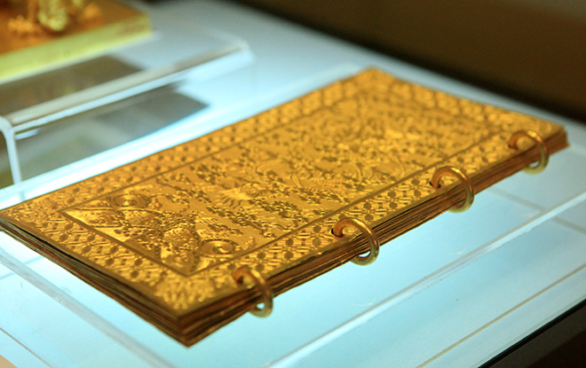 Kim sách bằng vàng, niên hiệu vua Gia Long thứ 5 (1806). Sách gồm 9 tờ, 2 tờ bìa trước và sau được trang trí hình rồng mây, 7 tờ ruột khắc sách văn