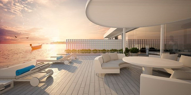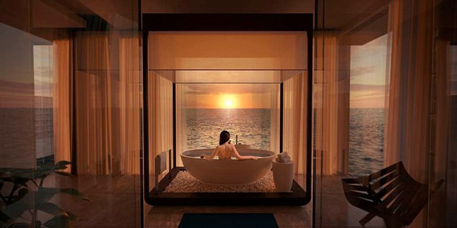 Khách có thể ngắm chân trời vô tận trong khi ngâm mình trong bồn tắm. Phía đối diện biệt thự là hướng mặt trời mọc và hồ bơi vô cực.