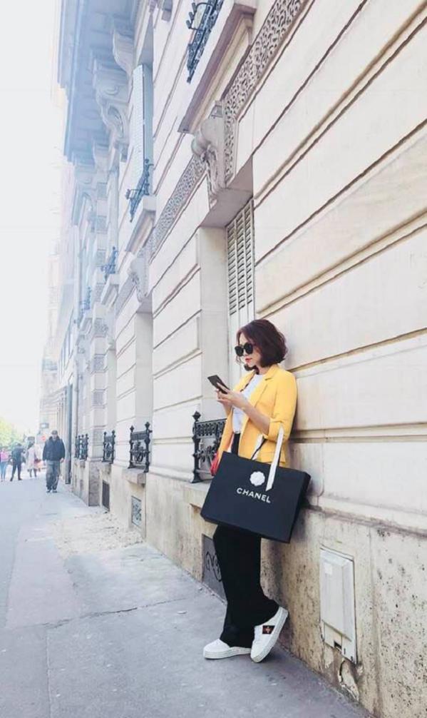 Mặc dù đã là bà mẹ 2 con nhưng nhờ chế độ ăn uống tập luyện hợp lý, Đào Lan Phương vẫn giữ được vóc dáng gọn gàng như thời con gái. Sự kết hợp giữa áo khoác vàng với áo dây và quần trắng, nhấn thêm tone đen của túi và kính râm khiến cựu người mẫu trở nên rực rỡ và gợi cảm trên đường phố Pháp.