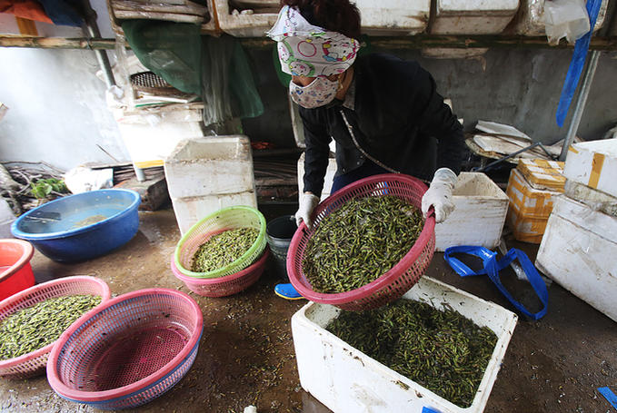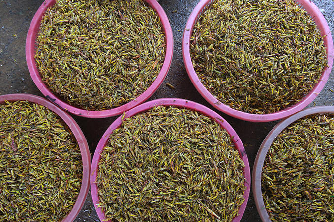 Các rổ châu chấu được làm sạch để khô nước, chờ ướp đá, đóng thùng đem đi tiêu thụ.