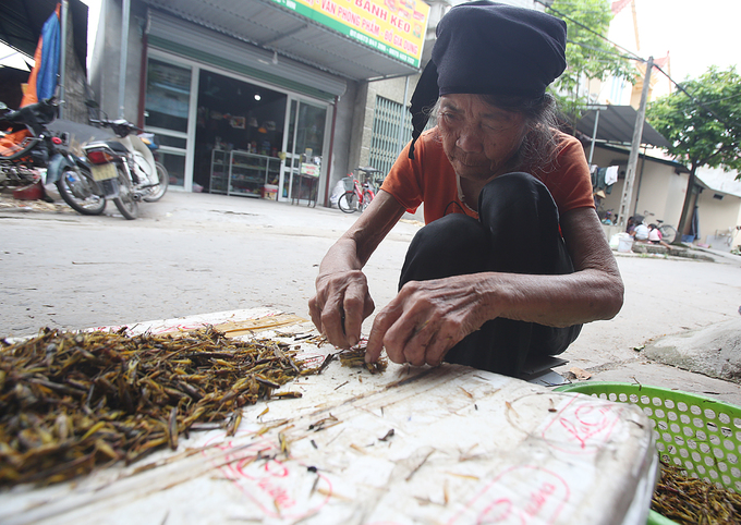 Bà Đặng Thị Cấm (89 tuổi) cho biết hàng ngày bà ngồi nhặt cánh châu chấu cùng mọi người trong gia đình cho vui, "đỡ buồn chân, buồn tay và kiếm thêm".