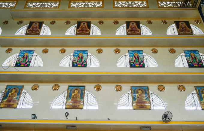 Xung quanh nội điện có nhiều ô cửa sổ trông như những đám mây trắng, mỗi ô lại treo một bức tranh đức Phật. Cạnh cửa sổ là những ô cửa thông gió có hình chữ “Phật”.
