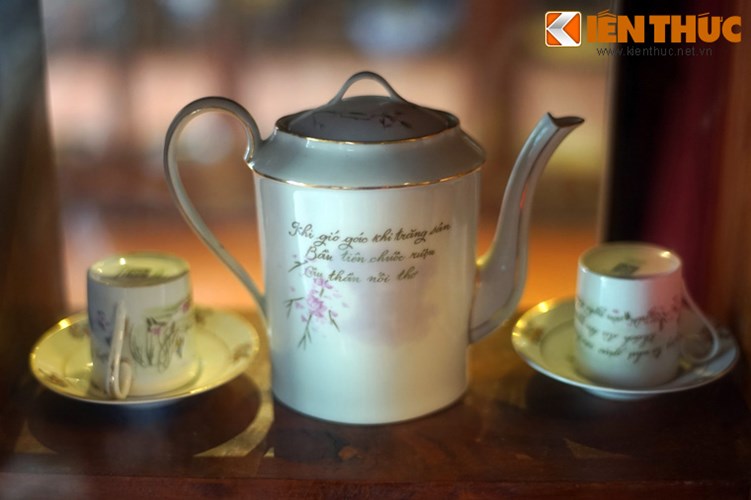 Đặc biệt, mỗi món đồ sứ ký kiểu của vua Bảo Đại đều được đề thơ của của các thi hào Việt Nam bằng chữ Quốc ngữ. Ở chiếc chén trong hình là câu "Bóng tà như giục cơn buồn/ Khách đà lên ngựa, người còn nghé theo", trích từ Truyện Kiều của Nguyễn Du.