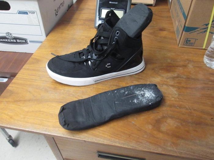 Một đôi giày thể thao trông có vẻ bình thường, nhưng lại nặng hơn…bình thường vì trong đế giày được gói ghém kĩ càng hơn nửa kí thuốc phiện.