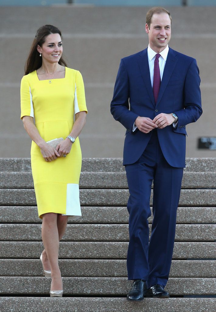 Nghe thì có vẻ lạ, nhưng đây là điều hoàn toàn thực tế. Vào năm 2014, Hoàng tử William và Công nương Kate Middleton từng có 1 chuyến công du đến Austraylia. Trong ngày đầu tiên tại đây, Công nương chọn diện mẫu váy vàng khá nổi bật của thương hiệu Roksanda.