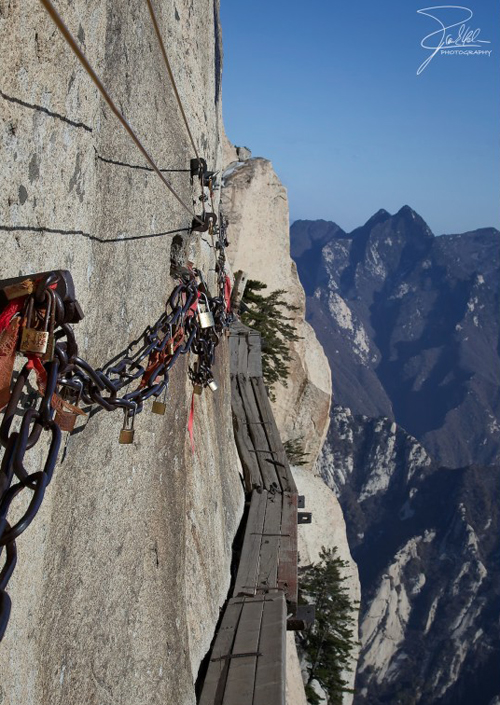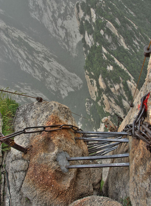 Để lên đến đỉnh núi, du khách phải băng qua những nấc thang chênh vênh được đính vào vách đá cao chót vót. Đoạn đường này được coi là nỗi ám ảnh khi người đi buộc phải băng qua những nấc thang bằng gỗ sơ sài, hẹp và một sợi xích để bám vào mà không có hàng rào bảo vệ.
