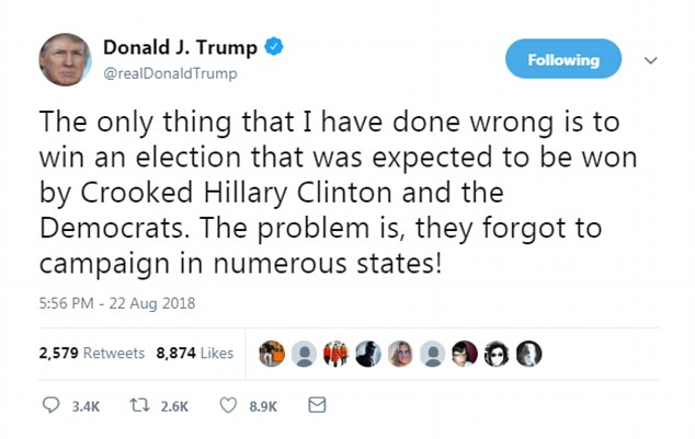 Ông Trump cũng tuyên bố điều duy nhất mà ông làm sai là "đã thắng trong một cuộc bầu cử mà người ta dự đoán chiến thắng thuộc về Hillary Clinton và đảng Dân chủ".
