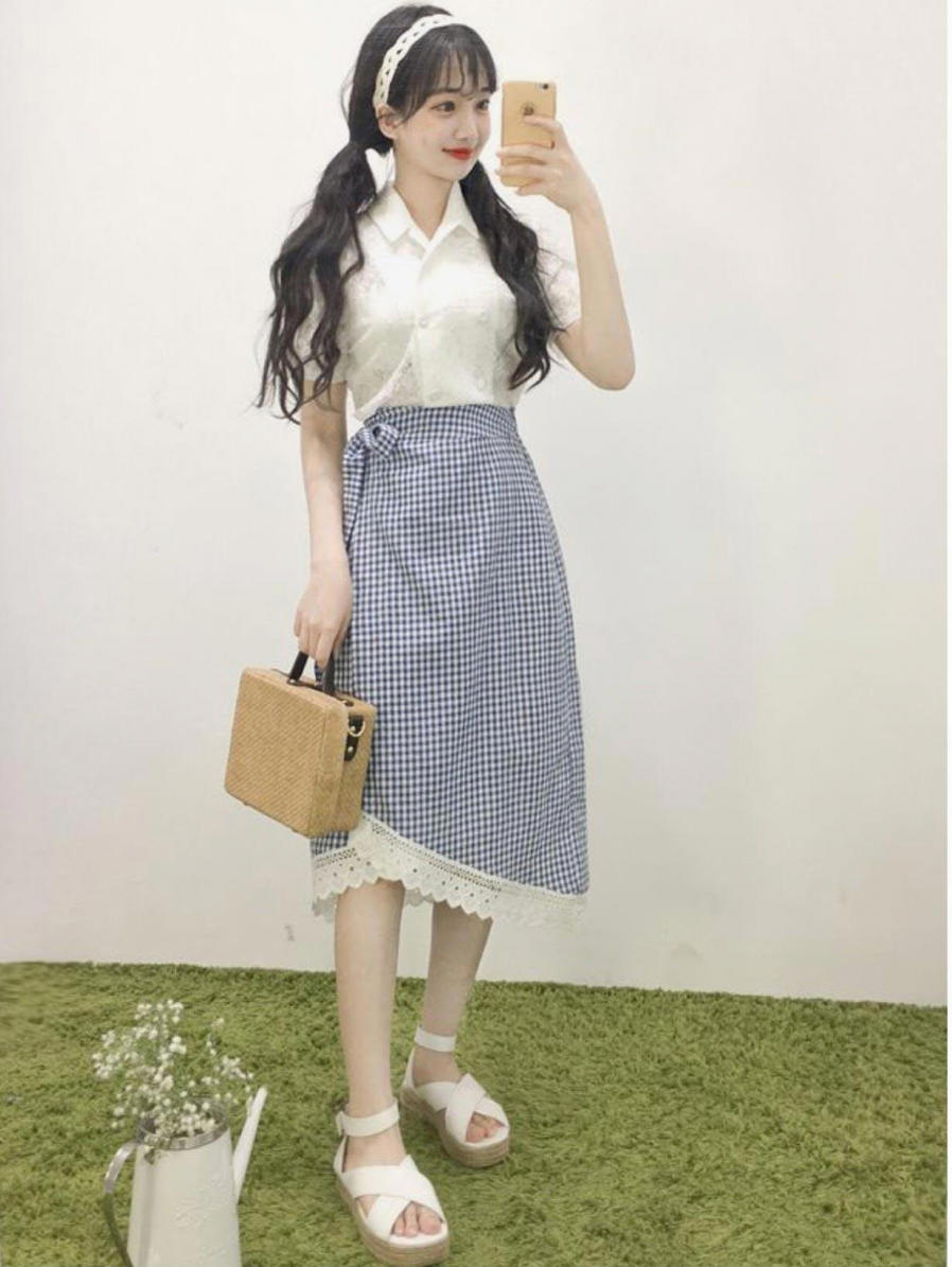 Chiếc chân váy dáng quấn ghi điểm nhờ điểm nhấn viền ren vô cùng nữ tính.