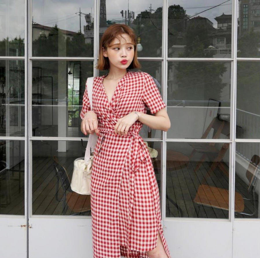Xu hướng váy quấn (wrap dress) cổ V quyến rũ kết hợp cùng hoạ tiết caro khiến cho bạn gái thêm trẻ trung, năng động.