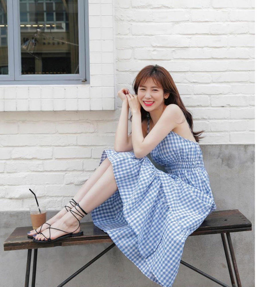 Set đồ đậm chất mùa hè với váy caro midi, túi cói và dép sandal chiến binh.