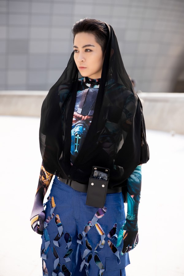 Không hề kém cạnh, stylist Kye Nguyễn lựa chọn trang phục đen cùng với áo khoác ngoài dáng dài của NTK Nguyễn Tiến Truyển kèm câu slogan đang cực kì hot: “No Drama, please”.