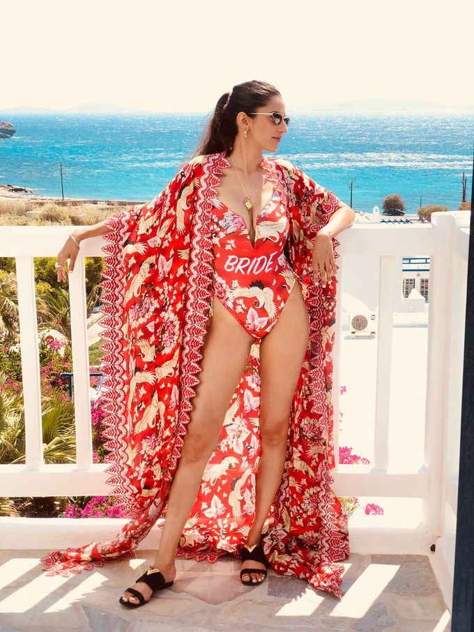 Trong tiệc độc thân ở đảo Mykonos, Hy Lạp, cô phối đồ mang hơi thở cowboy phóng khoáng, hoang dã.