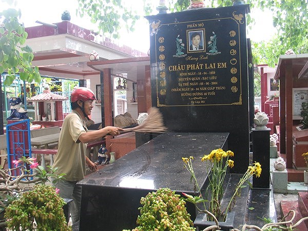 “Đó là ngôi mộ “nổi tiếng” nhất nghĩa trang này. Hỏi mộ Châu Phát Lai Em không ai không biết”- ông An, ngoài 60 tuổi sống ở nghĩa trang nói. Ngôi mộ này nằm dưới tán cây bồ đề gần trăm năm tuổi quanh năm xanh mát. Để có một vị trí “đắc địa” như vậy, số tiền bỏ ra tất nhiên không nhỏ.