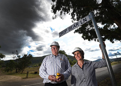 Thị trưởng Murray (trái) cầm trên tay "thuốc chống gấu" Vegemite bên cạnh cư dân địa phương Kylie Evans trong ngày gắn biển Drop Bear Lane. Tấm biển này bị đánh cắp năm 2017 và đã được thay thế ngay sau đó. Ảnh: Gareth Gardner.