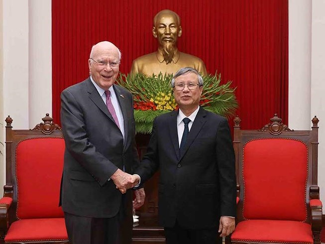 Chiều 18.4.2019, Thường trực Ban Bí thư Trần Quốc Vượng thay Tổng bí thư Nguyễn Phú Trọng tiếp đoàn Thượng viện Mỹ do thượng nghị sĩ Patrick Leahy làm trưởng đoàn. (Ảnh: PHƯƠNG HOA/TTXVN )