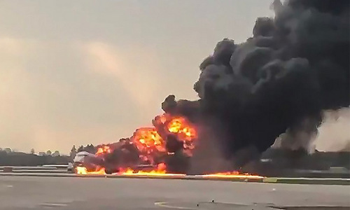 Chiếc Superjet bốc cháy trên đường băng hôm 5/5. Ảnh: TASS.