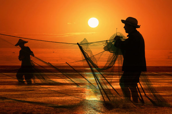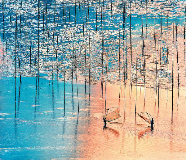 Chuẩn bị máy ảnh thật tốt cho bữa tiệc mặt bình minh và hoàng hôn ở Bắc Kì. Ánh nắng vàng buổi sáng buông xuống trên biển, biến bãi bồi thành một thế giới đầy màu sắc mơ màng. Ánh nắng phản chiếu trên mặt nước lung linh, bóng của ngư dân, thuyền đánh cá… trở thành một bức tranh rất hài hòa với sự tương phản của ánh sáng và bóng tối diệu kỳ.