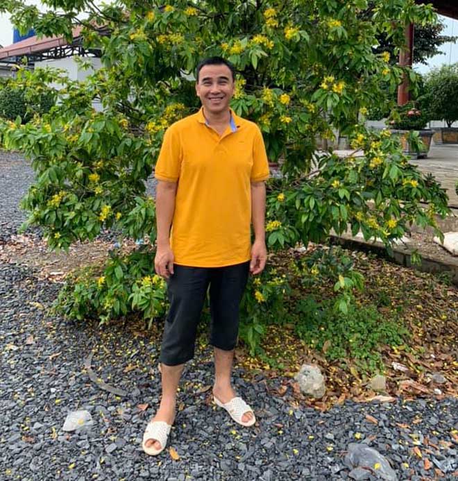 Hình ảnh MC Quyền Linh đi dép tổ ong, ngồi uống cà phê sáng mới đây.