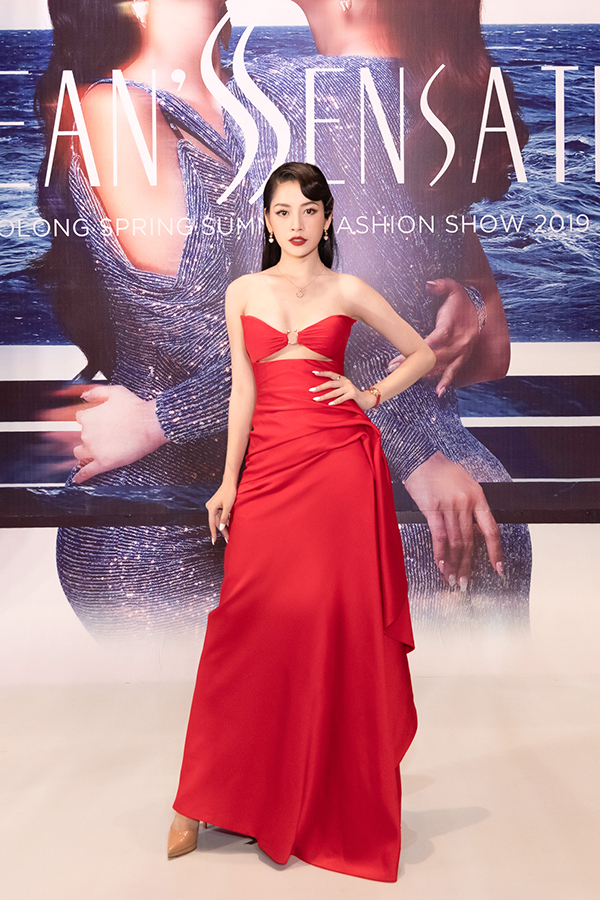 Thời gian gần đây, Chi Pu rất chịu khó đầu tư ăn mặc theo phong cách gợi cảm và quyến rũ khiến nhiều người bất ngờ. Xuất hiện tại một sự kiện thời trang, "nàng Cám" diện chiếc đầm dạ hội màu đỏ nổi bật, trang điểm và làm tóc theo phong cách hoài cổ đã giúp Chi Pu như một quý cô thời thượng một xách xuất sắc. Điểm nhấn của thiết kế này là phần cắt xẻ ngực tạo ra khoảng hở lấp ló, gây tò mò.