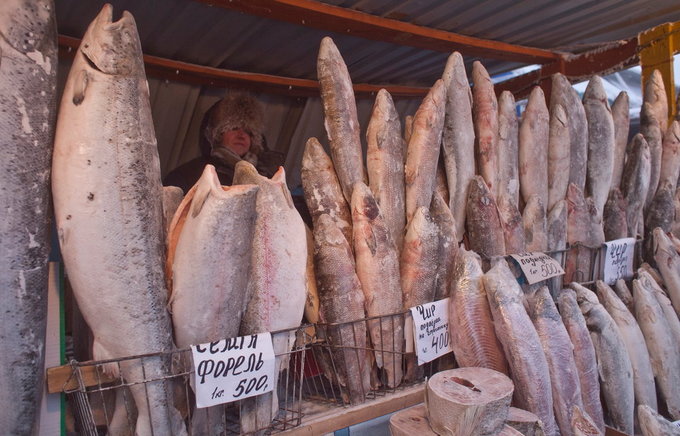 Ngoài ra, để chống chọi với cái lạnh, họ thường xuyên sử dụng một loại đồ uống có tên Russki chai hay trà Nga, nấu từ trái cây cắt lát, quế, cỏ bốn lá. Trên ảnh là một quầy bán cá trong một chợ nông sản ở Oymyakon. Ảnh: Insider.