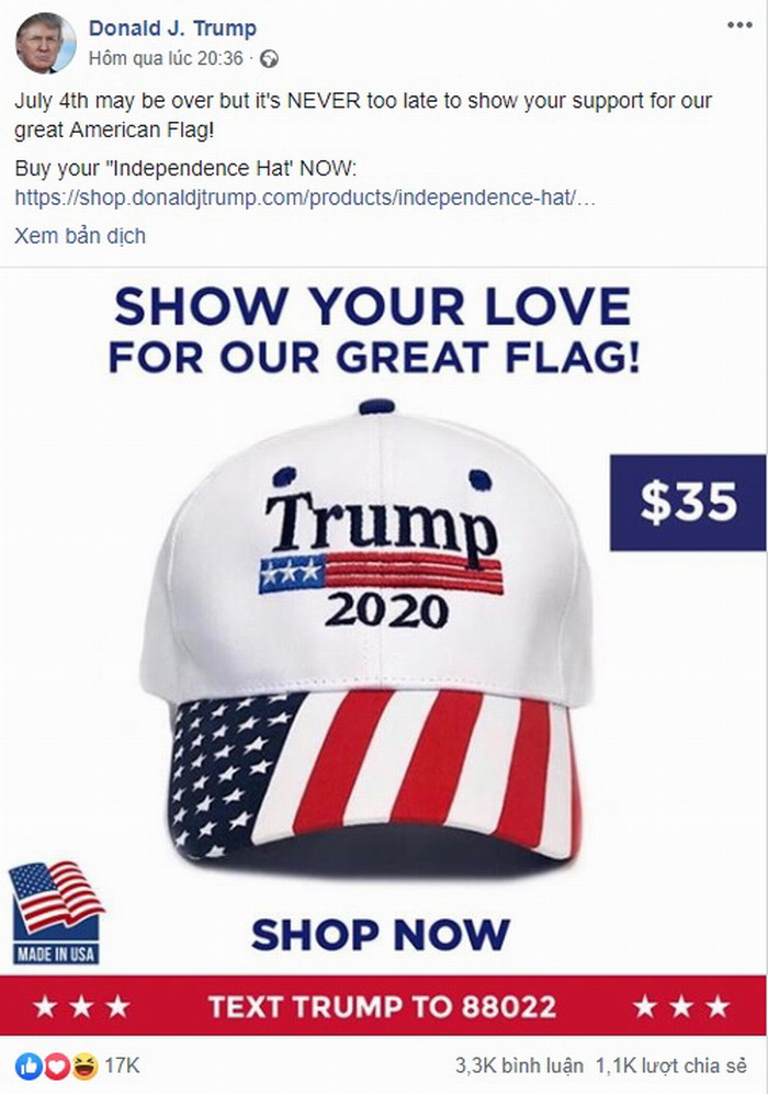 Ông Trump đã mở "shop" bán mũ mới với giá 35$ vào hôm qua. Tổng thống quảng cáo rằng: Ngày 4 tháng 7 có thể kết thúc nhưng KHÔNG BAO GIỜ quá muộn để thể hiện sự ủng hộ của bạn đối với Cờ Mỹ vĩ đại của chúng ta!