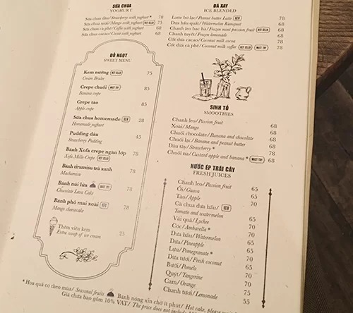 Thực đơn một cửa hàng cà phê ở Hà Nội với ký hiệu tiền tệ bị loại bỏ. Ảnh: Magicalmangohome.