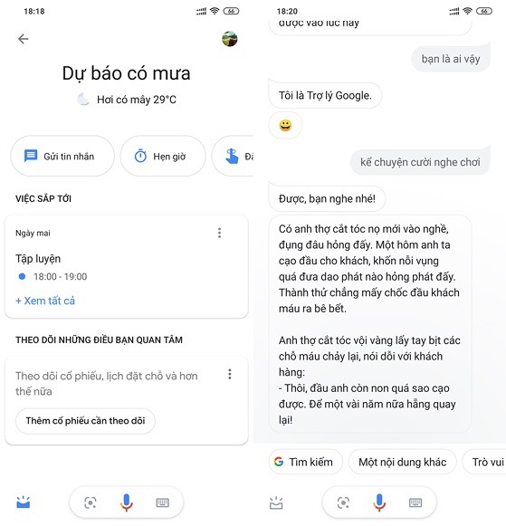 Sau đó, bạn hãy chuyển sang thẻ Cập nhật nếu ứng dụng không tự động mở, bấm vào biểu tượng micro và bắt đầu trò chuyện với trợ lý ảo, Google Assistant sẽ theo dõi cuộc trò chuyện, xác định ngữ cảnh và đưa ra phản hồi bằng các thông tin chính xác.