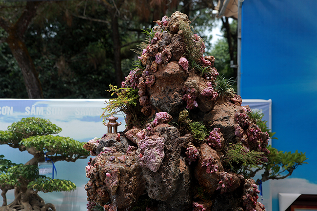 Tác phẩm non bộ có chiều cao 1,6m được đặt trên một khay đá hình e-líp nguyên khối có kích thước 135x205cm.