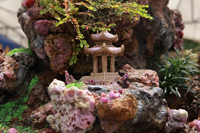 Trên mỗi ngọn núi chủ nhân gắn những cây nhỏ sao cho phù hợp với kích thước hòn non bộ