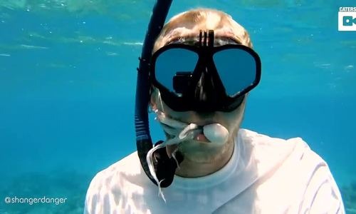 Bạch tuộc chui vào miệng khách lặn. Con bạch tuộc nhỏ chui cả thân vào miệng du khách. Sau đó nó mới phát hiện bản thân bị nhầm chỗ.