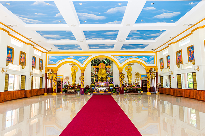 Trong điện Phật có gắn nhiều phù điêu tượng Bồ tát Quán Thế Âm, tranh Phật tích trên kính và những chùm đèn mạ vàng 24K.