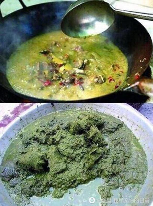 Món ăn này không có tên cụ thể, là một đặc sản chỉ có ở vùng Vân Nam, Trung Quốc. Thoạt nhìn qua, nhiều người sẽ thắc mắc thứ nước màu xanh xanh trong món đặc sản này có thể là nước ép loại rau củ nào đó. Nhầm rồi, đây thực chất là nước ép từ bã thức ăn bên trong dạ dày bò.