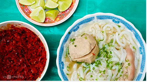 Quán có thâm niên 44 năm nằm trong một con hẻm nhỏ gần Đại học Sân khấu Điện ảnh TP HCM ở quận 1. Như bao quán bình dân khác, khách ngồi trên bàn ghế thấp, xung quanh bếp của bà chủ để thưởng thức món ăn. Do nồi nước lèo cũng đặt ngay đó nên khi ngồi vào bàn, bạn sẽ ngửi thấy mùi thơm của nước hầm xương ống bò. Quán có ít người phục vụ nhưng luôn đông khách.
