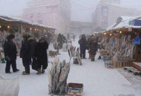 Thành phố lạnh lẽo nhất thế giới, nhiệt độ nơi này xuống tới -64 độ, hơi thở cũng đóng băng. Tại đây với cái lạnh cắt da cắt thịt này, người dân có thể uống hết 1 chai rượu Vodka với đồ nhắm chỉ vỏn vẹn… 1 quả dưa chuột muối.
