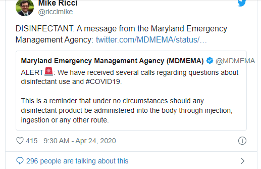 Some Maryland residents, however, still dialed the Maryland Emergency Management Agency to ask about disinfectant use.