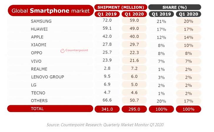Samsung, Huawei và Apple vẫn là ba hãng điện thoại hàng đầu. Cả Canalys và Counterpoint đều xếp Xiaomi ở vị trí thứ tư, lần đầu tiên chiếm 10% thị phần toàn cầu.