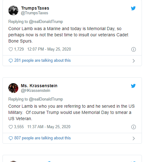 What really got to critics on Twitter was Trump’s attack on a veteran on Memorial Day from a president who dodged the Vietnam War draft with a suspect medical complaint of “bone spurs.” It’s not known why Trump would call Lamb a “fraud.”