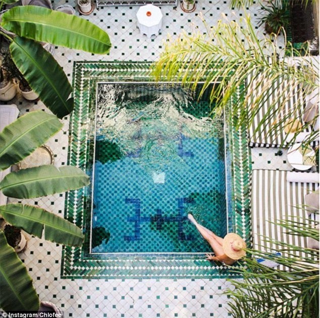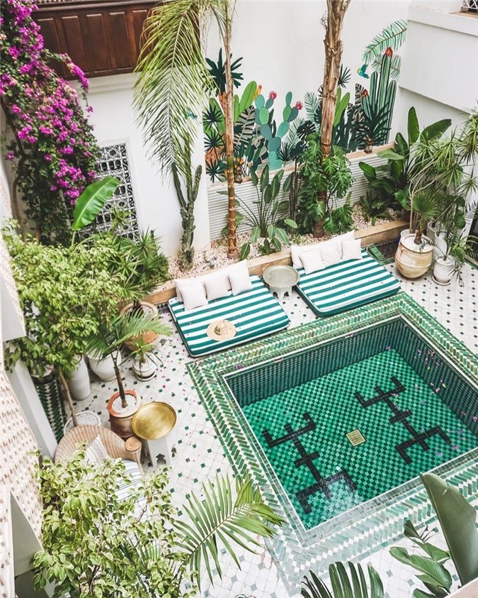 Bể bơi khách sạn Riad Yasmine, Marrakech, Morocco: Dù có diện tích khá nhỏ, nhưng vẻ đẹp đặc biệt đủ để khiến bể bơi này trở nên nổi tiếng khắp thế giới. Thậm chí, từng có thời, bể bơi này đã tạo ra "cơn sốt" check-in, phủ ngập Instagram. Ảnh: @beige_bath_melts/@gypsea_lust.