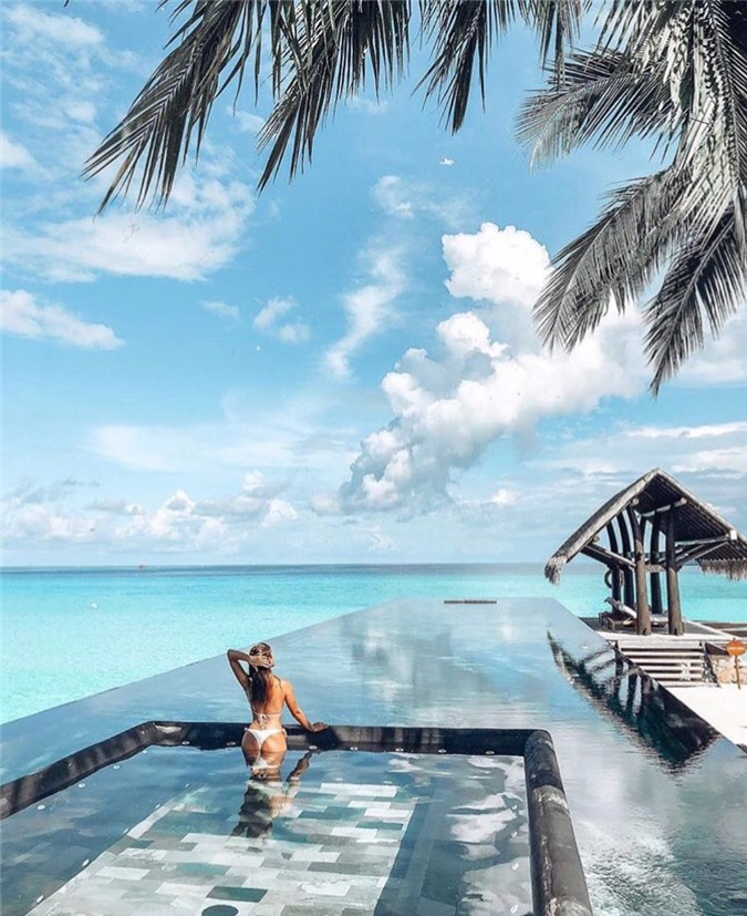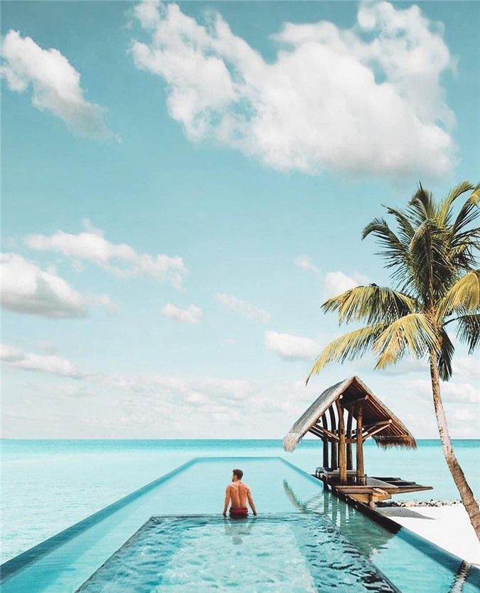 Bể bơi vô cực, One&Only Reethi Rah, Maldives: Chỉ riêng khung cảnh cũng đủ để bể bơi này chinh phục du khách. Bể có thiết kế "song trùng", với một bể bơi nhỏ lồng trong bể bơi lớn. Điều này khiến bể như hòa vào đường chân trời, cho người dùng tha hồ tận hưởng làn nước mát lạnh giữa nắng gió Maldives. Ảnh: @ooreethirah.