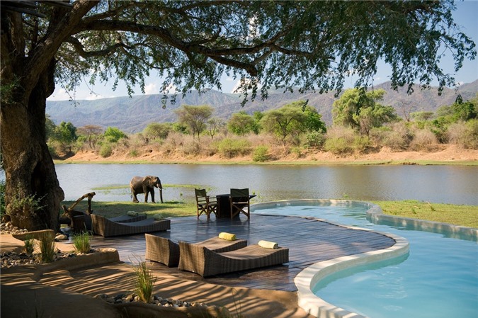 Bể bơi tại Chongwe River House, Zambia: Điều khiến hồ bơi này đặc biệt là tầm nhìn ra sông Chongwe, khu vực sinh sống của nhiều loại động vật hoang dã. Ngâm mình trong bể bơi nằm dưới tán cây râm mát, bạn có thể vừa nhâm nhi ly cocktail, vừa ngắm nhìn những loài thú hoang như voi, hươu cao cổ bình thản đi ngang qua. Ảnh: Real Africa.